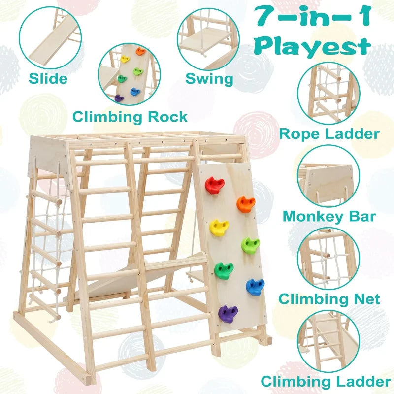 7 in 1 Pikler Indoor Playground Jungle Gym Playset, Wooden Montessori Climber with Slide, Rock Climb Wall, Monkey Bars,
