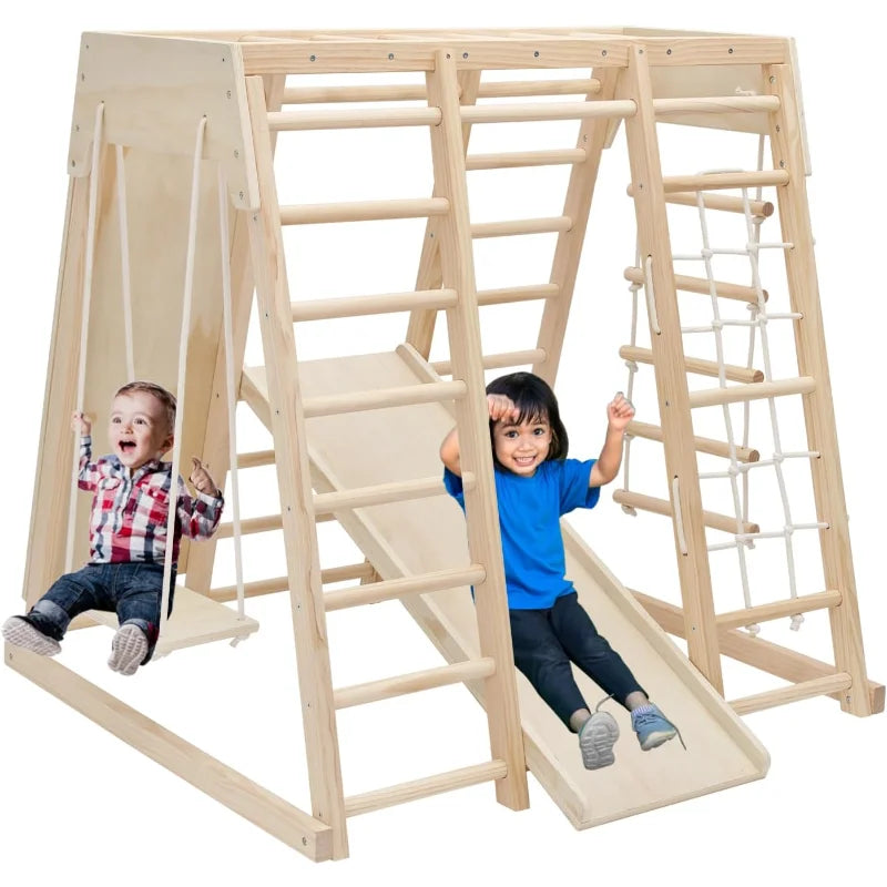 【Natural Wood Material】Crafted from natural pine wood, our indoor jungle gym stands out for its robust durability and eco-friendliness compared to plastic alternatives, offering a non-toxic, harmless environment for children's play. The wood's smooth finish and strong structural integrity ensure a safe playing surface, free from sharp edges or hazardous materials. While this playset is designed with child safety in mind, we still recommend parental supervision to enhance the play experience