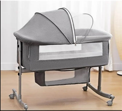 One-Off. New in original box. Baby Basinette. Easy to set up and roll around. Cozy canopy reduces light and sound for a peaceful sleep environment. Utility shelf below for diapers and more. Regular price 95.00.