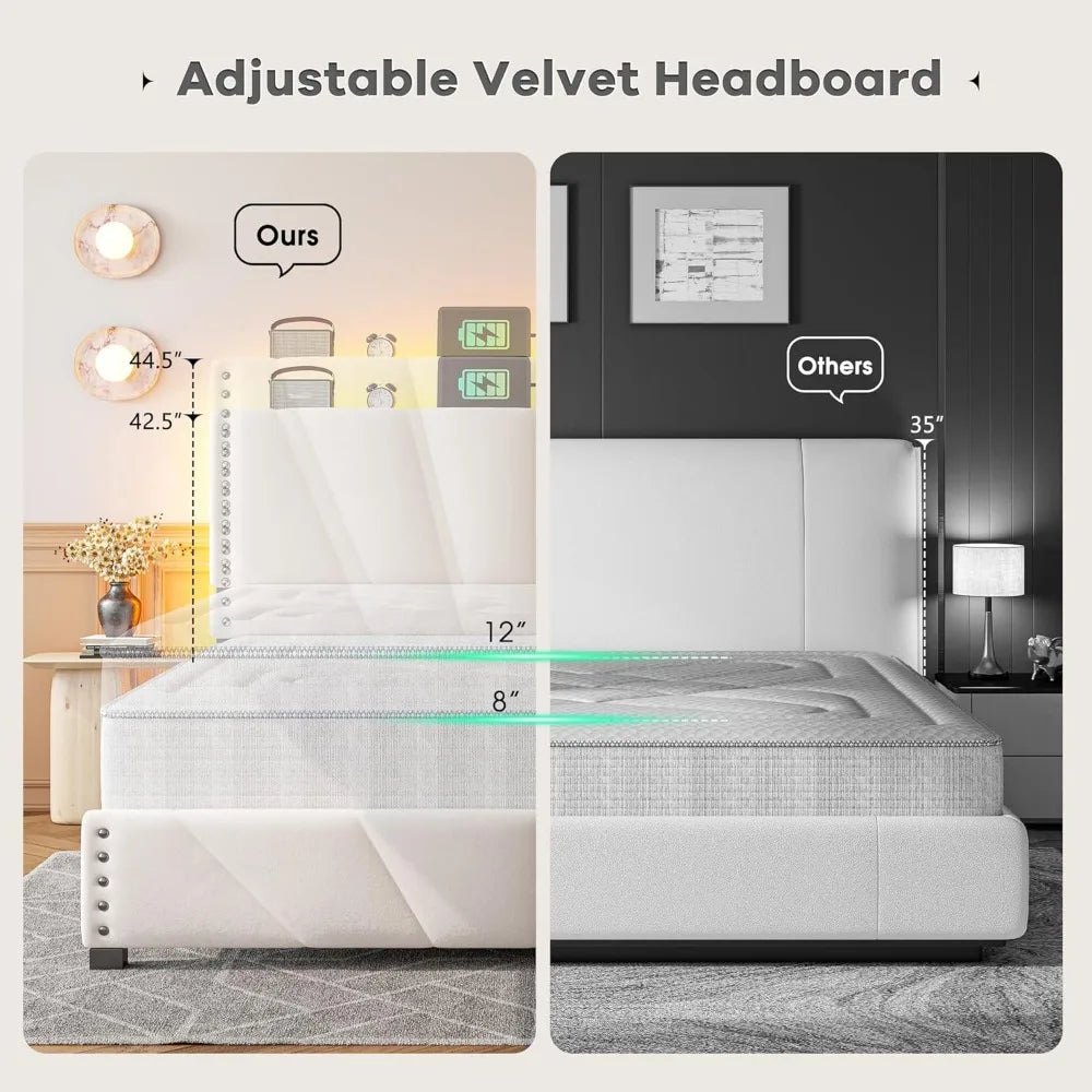 EnHomee King Size Bed Frame with Velvet Headboard and LED Lights, Storage Headboard Platform Bed with Charging Station, Sturdy W
