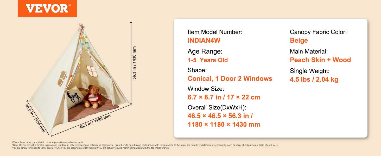 VEVOR Kids Play Tent Teepee Tent for Kids 1-5 Years Old Tent for Kids with Windows for Indoor and Outdoor Toddler Tent